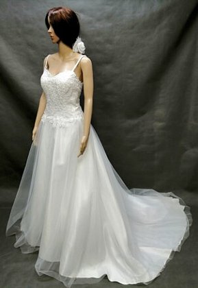 Svatební šaty .0081-půjčení,velikost 42-46.Krásné bílé šaty s vlečkou. Na ramínka ta lze odpárat nebo vyměnit za široká třeba i krajková dle dohody a přání nevěsty. Materiál taft ,krajka ,korálky ,tylová sukně.