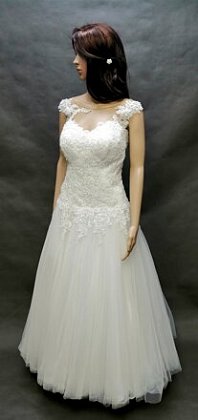 Svatební šaty .1231-půjčení,velikost 40-44. Možnost všít rukávy. Lze s obručí i bez ní. Materiál-satén ,krajka ,kamínky ,tylová sukně.