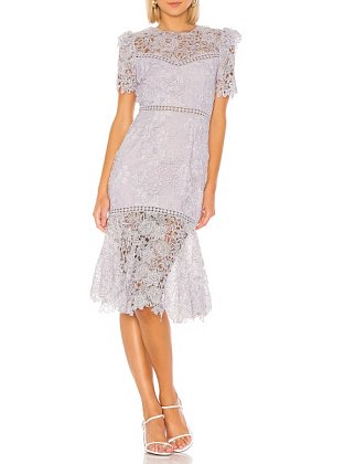Jemné lila šaty klasického stylu s ozdobným volánem se hodí pro každou příležitost.