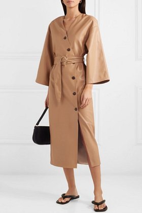 Nevšední šaty z umělé kůže s tredny páskem, hodící se pro chladnejší dny.