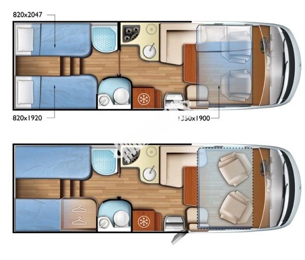 Rozměry v metrech (délka, šířka, výška): 7,38/ 2,31/ 2,89, 4 osoby jízda 4 spaní. Obytný vůz je plně zařízen vším potřebným pro cestování a připraven pro celoroční provoz.