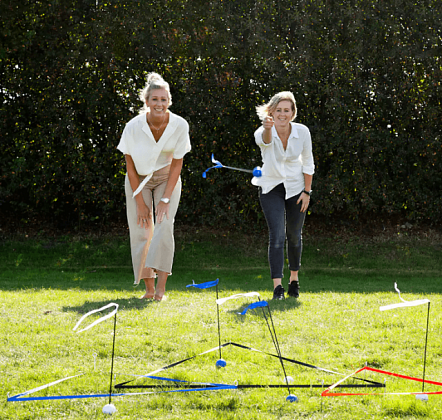 Balení obsahuje 6 tyček (vždy tři pro každého hráče nebo jeden tým), dále pak tři různě veliké trojúhelníky – ty vytvoříte ze stuhy a praktickou tašku pro snadné uschování celé hry. Tyčky jsou zatíženy „golfovým“ míčkem, tak aby krásně padaly k zemi. Na konci není ostrý hrot, ale důrazně doporučuji dávat pozor zejména při hře s dětmi, tak aby nedošlo k poranění.