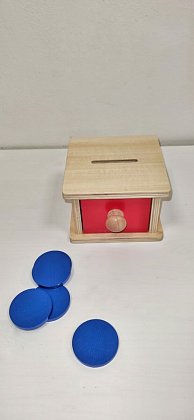 Kojenecká kasička je Montessori pomůcka založená na jednoduchém principu. Dítě se snaží natočit mince tak, aby pasovaly do otvoru a vhazuje je. Mince poté padají do šuplíku, který vysune a mince zase vyndá. Dítě si vhazováním trénuje prostorové vjemy a prstový úchop.