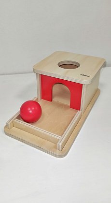 Cílem je umístit červenou kuličku do daného otvoru. Kulička následně propadne, ihned se objeví v ohrádce a je dítku opět k dispozici.