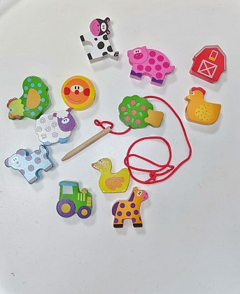 Navlékání zvířátek na jehlu s nití učí děti trpělivosti, soustředění a rozvijí jemnou motoriku. “Korálky” v motivu farmy jsou velké akorát do ručičky a lze se s nimi učit zvířátka a barvy.