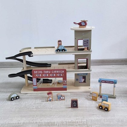 Třípatrová garáž s autíčky, kterou je navíc možné napojit na vláčkodráhu, je vybavena mycí linkou. Dále stojany pro doplnění pohonných hmot, nechybí ani obsluha, informační stojany a tabule, autíčka a helikoptéra. Tato montessori dřevěná hračka se zaměřuje na rozvoj dovedností a poznatků během hry.