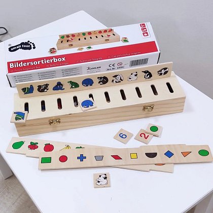 Děti musí vhazovat obrázky do příslušných otvorů. Dřevěná hra rozvíjí rozpoznávání tvarů, barev a jiných obrázků.