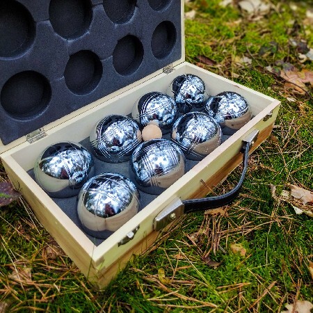 Hra obsahuje: Dřevěný kufr s 8 koulemi a dřevěnou kuličkou (prasátkem)