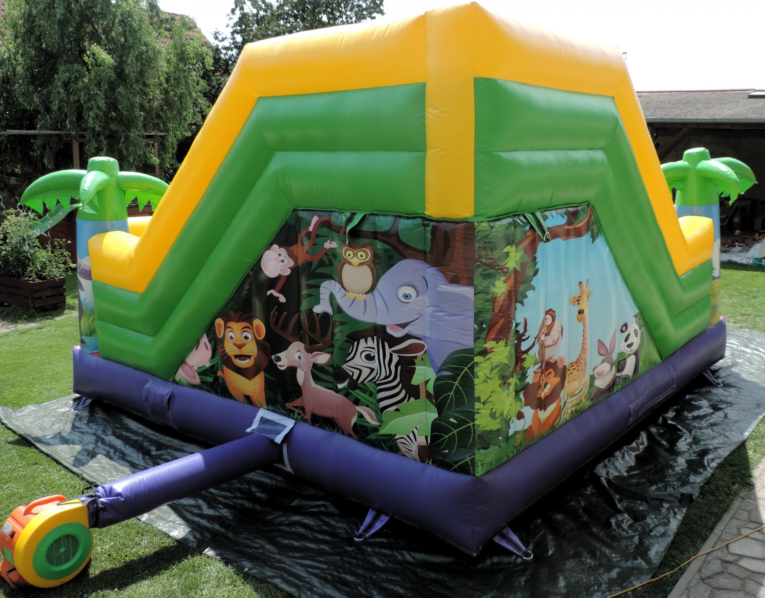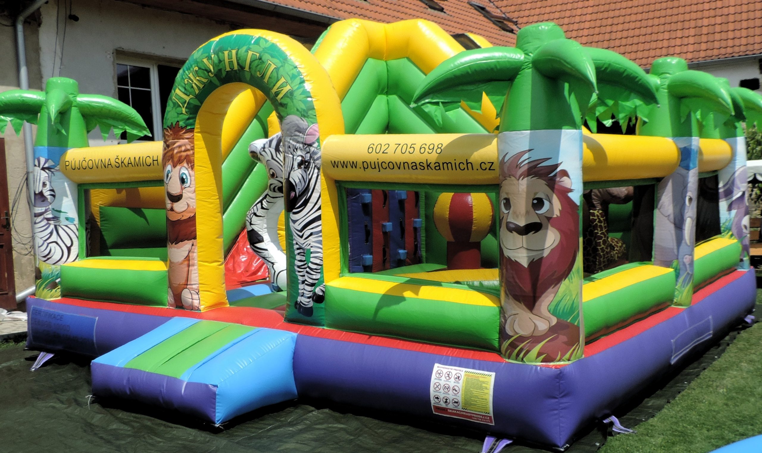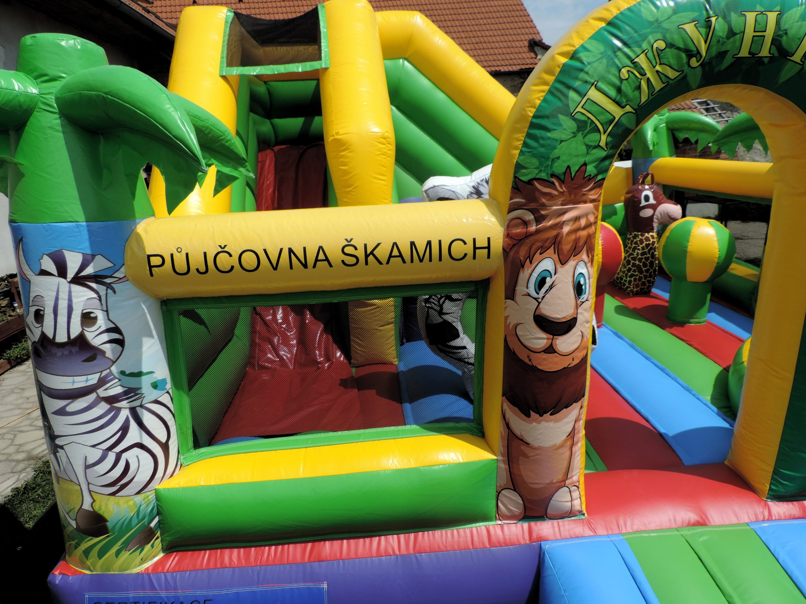 Doprava účtována z místa sídla tam a zpět. Půjčovné zahrnuje zprovoznění, zapůjčení míčků, kotvící kolíky, plachta pod atrakci, následné složení hradu.