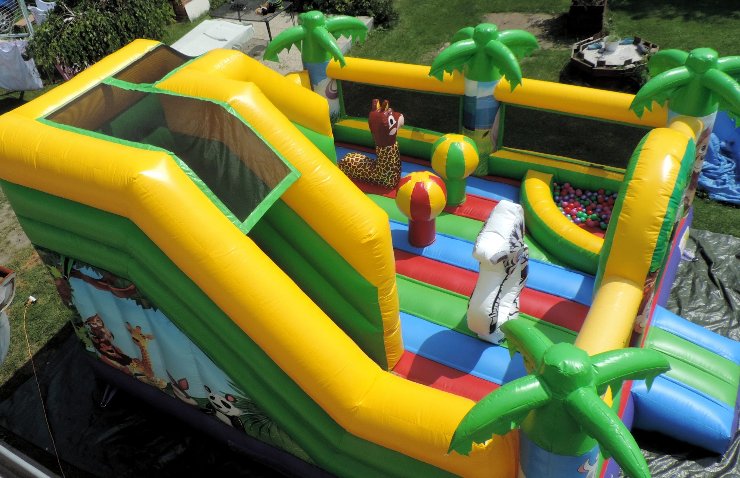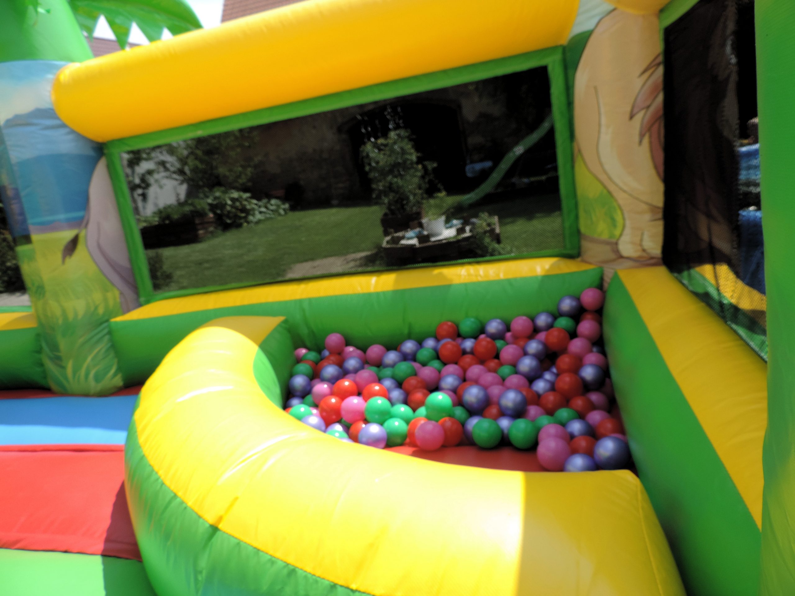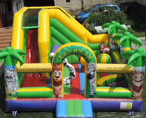 Skákací hrad se skluzavkou, bazénkem s míčky, lezeckou stěnou a dalšími herními prvky.